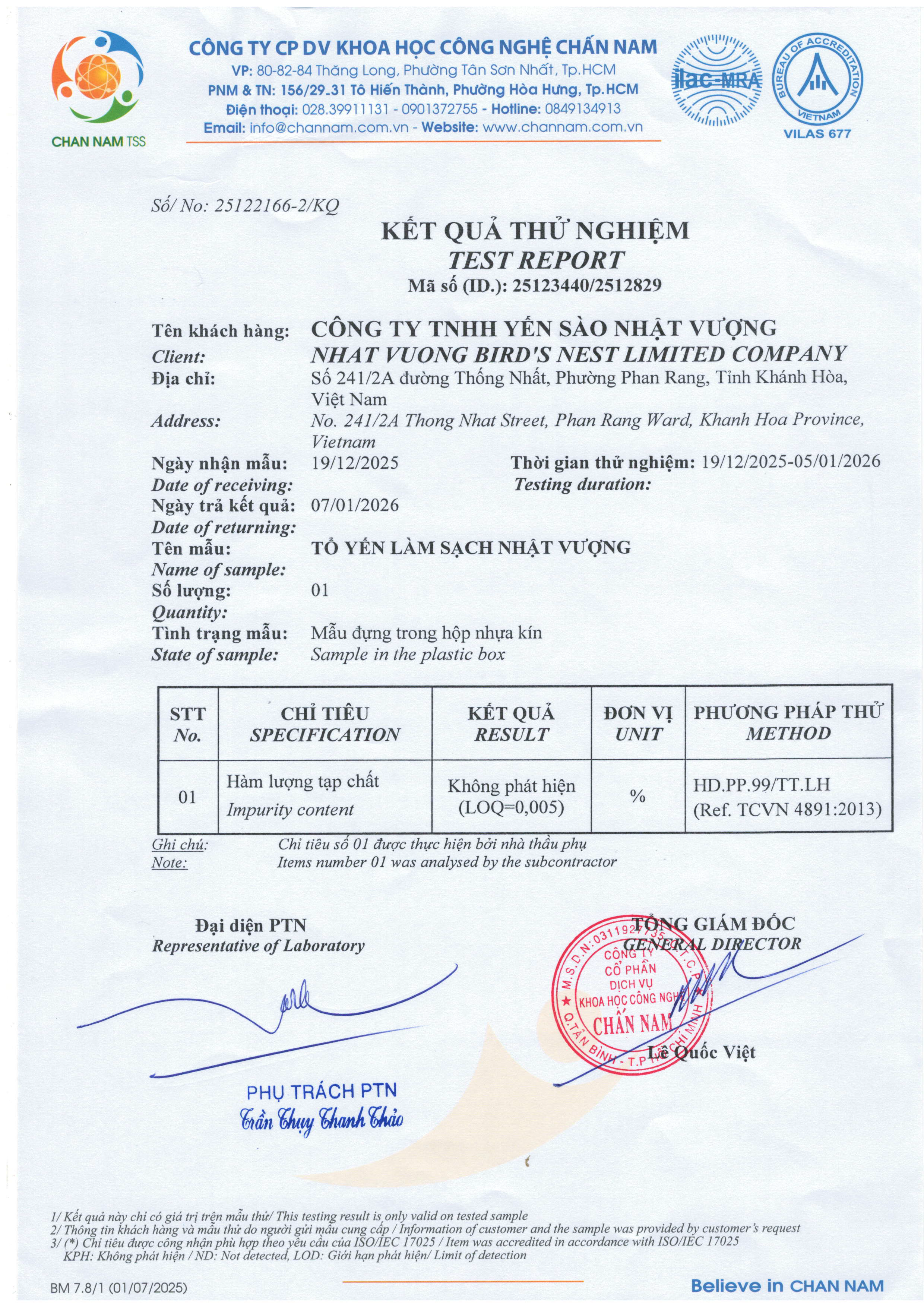Quý khách có thể tham khảo các chứng nhận pháp lý của Yến sào Nhật Vượng.